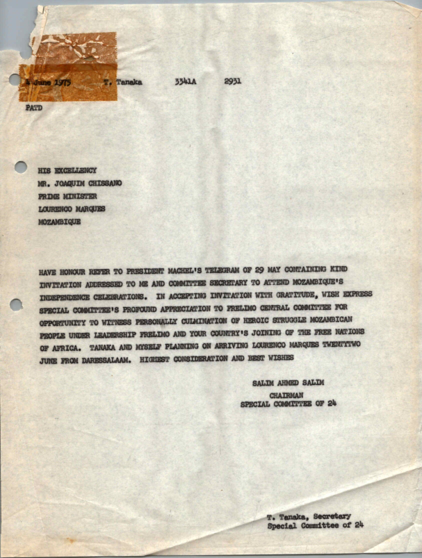 Correspondence to Joaquim Chissano on Mozambique Independence Celebrations
